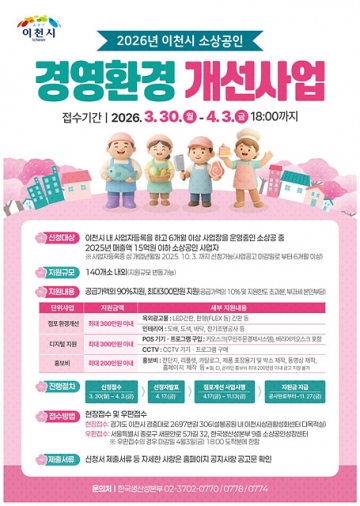 이천시(시장 김경희)는 관내 소상공인의 경영환경 개선과 경쟁력 강화를 위한 ‘2026 소상공인 경영환경개선사업’ 신청 접수를 시작한다고 밝혔다.